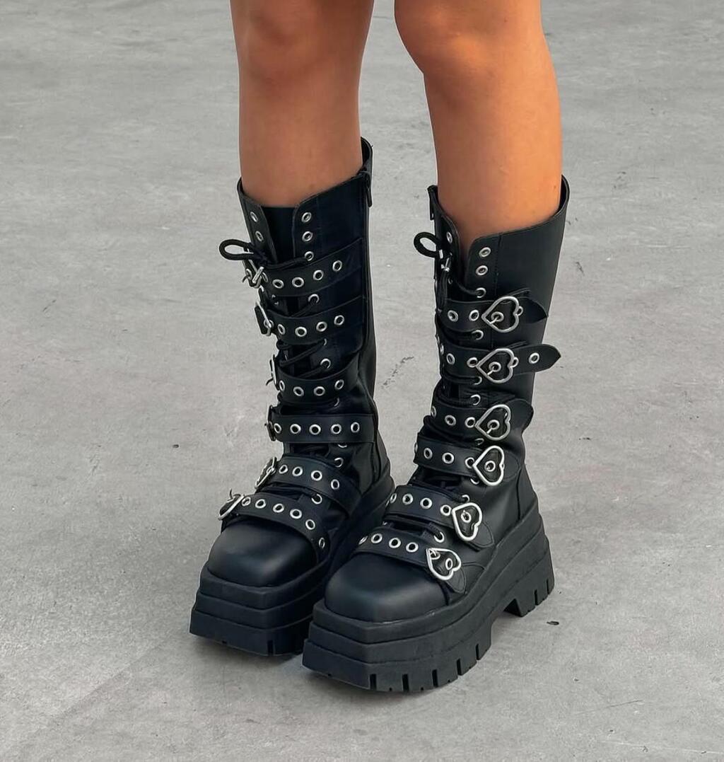 ¡Descubrí las Botas Eclipse, el calzado que elevará tu estilo! Con un diseño único, estas botas caña alta negras cuentan con hebillas en forma de corazones, que aportan un toque romántico y moderno a tu look.